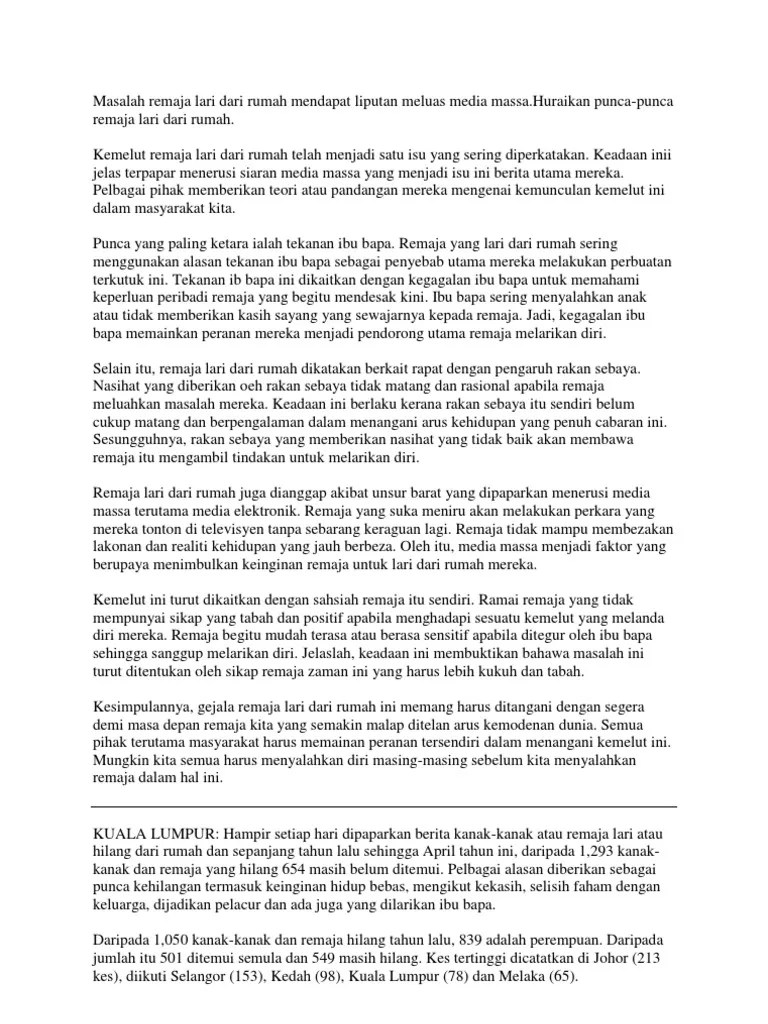 Penutup Karangan Remaja Lari Dari Rumah Pendek kata semua hujah yang dihuraikan tadi membawa budaya lari rumah ini sebagai satu perkara yang lazim berlaku dalam kalangan remaja kita. HARI INI 27032012 KIRA-KIRA JAM 6 PETANG SAYA SENDIRI MENGALAMI SENDIRI INSIDEN REMAJA LARI RUMAH. Punca yang paling ketara ialah.